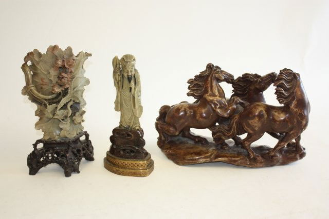 SoldBeautiful Chinese 3 Piece Soapstone StatueThree piece soapstone statue needs new sticks 14"H - Small damage on back top 11"H Damage Base 12"W x 5"H- Private Collection N.Y.See Sold Price