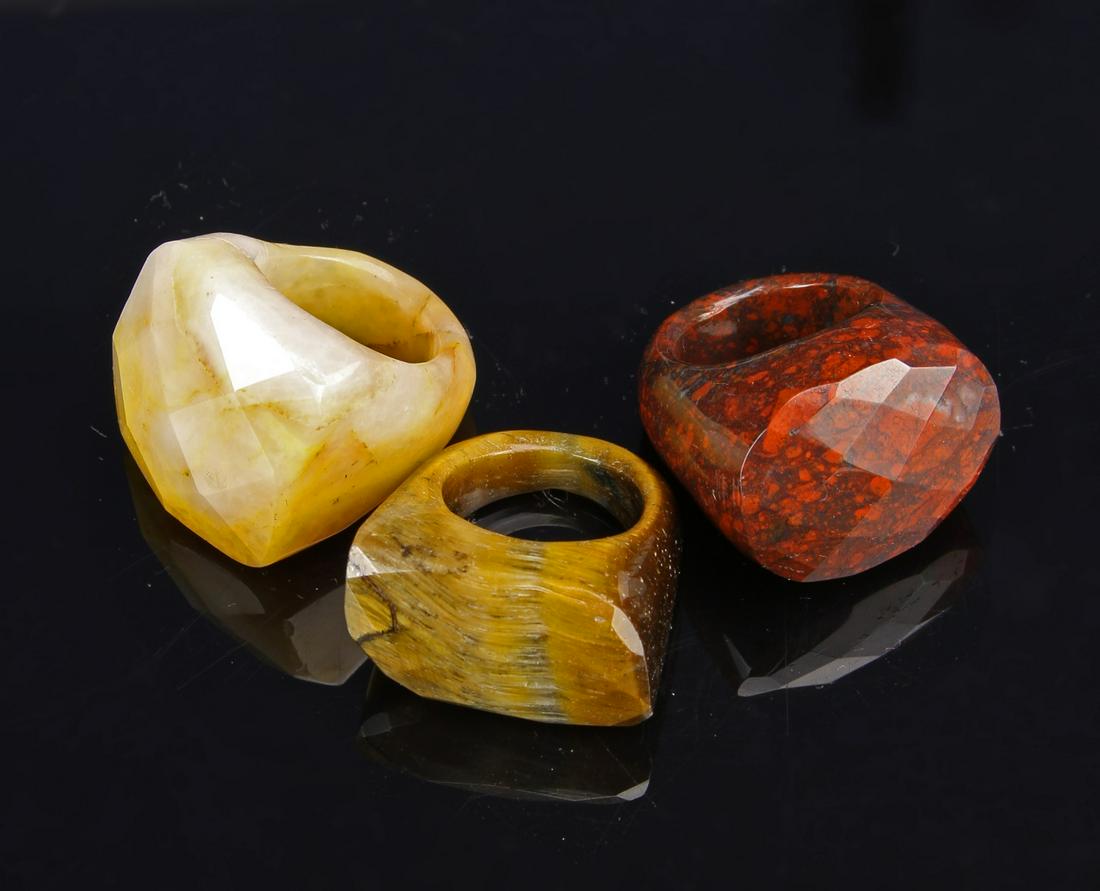 SoldGroup Chinese Jade Thumb RingsGroup of three collectible nicely carved and polished jade/stone thumb rings, the stone of pale celadon color with russet inclusions, or of translucent white and apple green colors. 1.4inch D, 1.1inchSee Sold Price