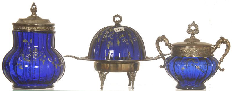 THREE COBALT BLUE TORQUAY PATTERN GLASS ITEMS WITH