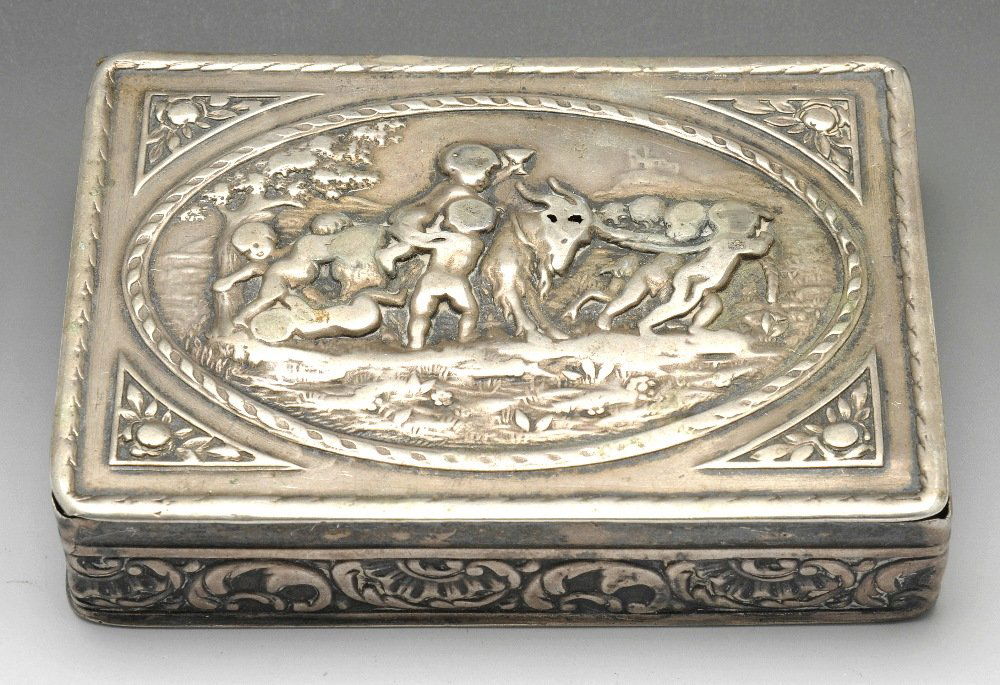 German Sterling Silver Repoussé Snuff Box Pendant, Figural Scene, 19th CenturyFeb 20, 2026A LARGE SILVER PIDYON HABEN TRAY. Continental, 20th century.Feb 18, 2026Gorham Art Nouveau Sterling Silver Cigar Card Box 1900s2 days LeftA Gorgeous Gilt-Silver 'Buddha Shakyamuni' Box With A Scroll Of Buddhist SutrasMar 06, 2026DERBY AND HORSE RACING INTEREST: a good silver box D & J Wellby, London 191619TH CENTURY EUROPEAN ORNATE SEWING ETUI / JEWELRY CASKET BOX2 days LeftA SILVER BELT BUCKLE FOR YOM KIPPUR. In Polish style. With the scene from the Binding of Isaac.Feb 18, 2026Solid Silver Hinged Dresser Box, German Hallmarks, 800 Purity2 days LeftA silver seal box writing desk companion Asprey & Co Ltd, London 1920A RUSSIAN SILVER AND NIELLO CIGARETTE BOXFeb 17, 2026Estate Continental .800 Silver Trinket Box with Dumortierite Stone3 days LeftSevres Porcelain Jewelry Box H: 4" W: 10" x D: 5.4" w/ Cherubs SceneFeb 14, 2026RUSSIAN SILVER CIGARETTE CASE, ALEXANDER II, fr. SOTHEBY's2 days LeftWWII TYPE GERMAN BATTLE F STALINGRAD CIGARETTE CASEFeb 14, 2026Sheffield Gallery Serving TrayFeb 16, 2026Grande piatto da parata in argento sbalzato La scena principale nel cavetto, raffigura "Il coraggioFeb 17, 2026