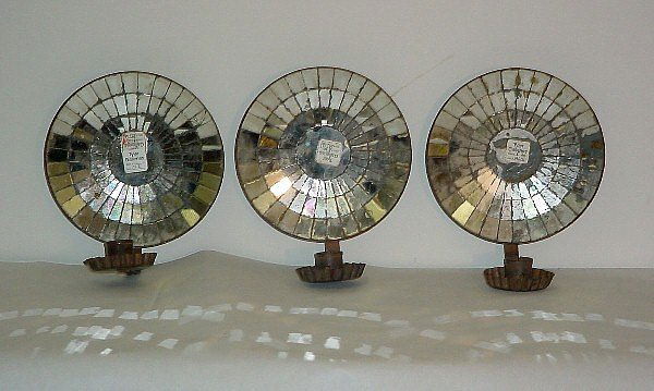 SoldPAIR MIRROR BACK TIN CANDLE SCONCESPAIR MIRROR BACK TIN SCONCES, THREE LIGHT SHEET IRON CANDLE SCONCES WITH NEW ENGLAND FAN CRESTSSee Sold Price