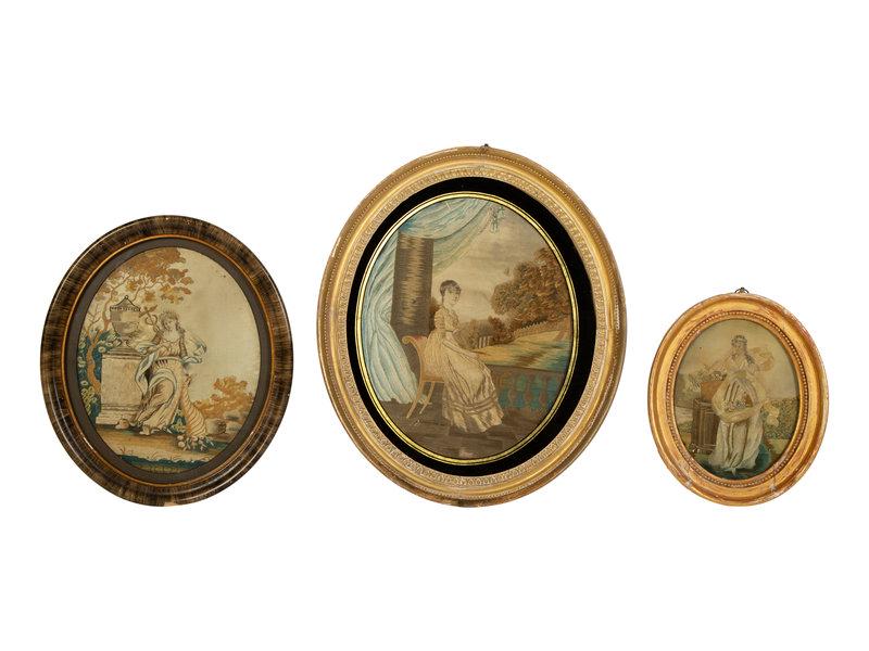 Three Continental Needlework and Silk Pictures in Gilt Frames