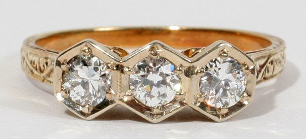 THREE DIAMOND, 14KT GOLD RING TRANSITIONAL CUT