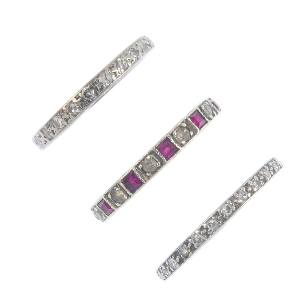Three diamond and gem-set full-circle eternity rings.
