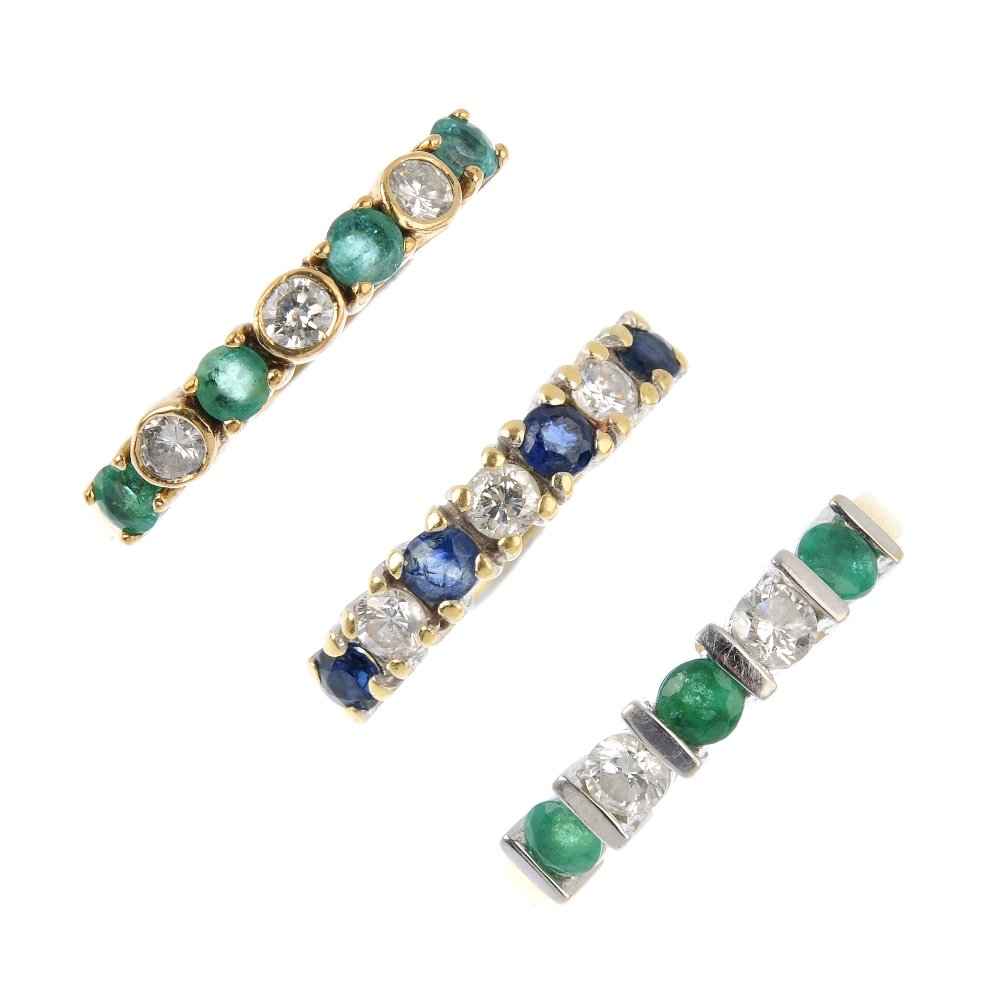 Three diamond and gem-set half-circle eternity rings.