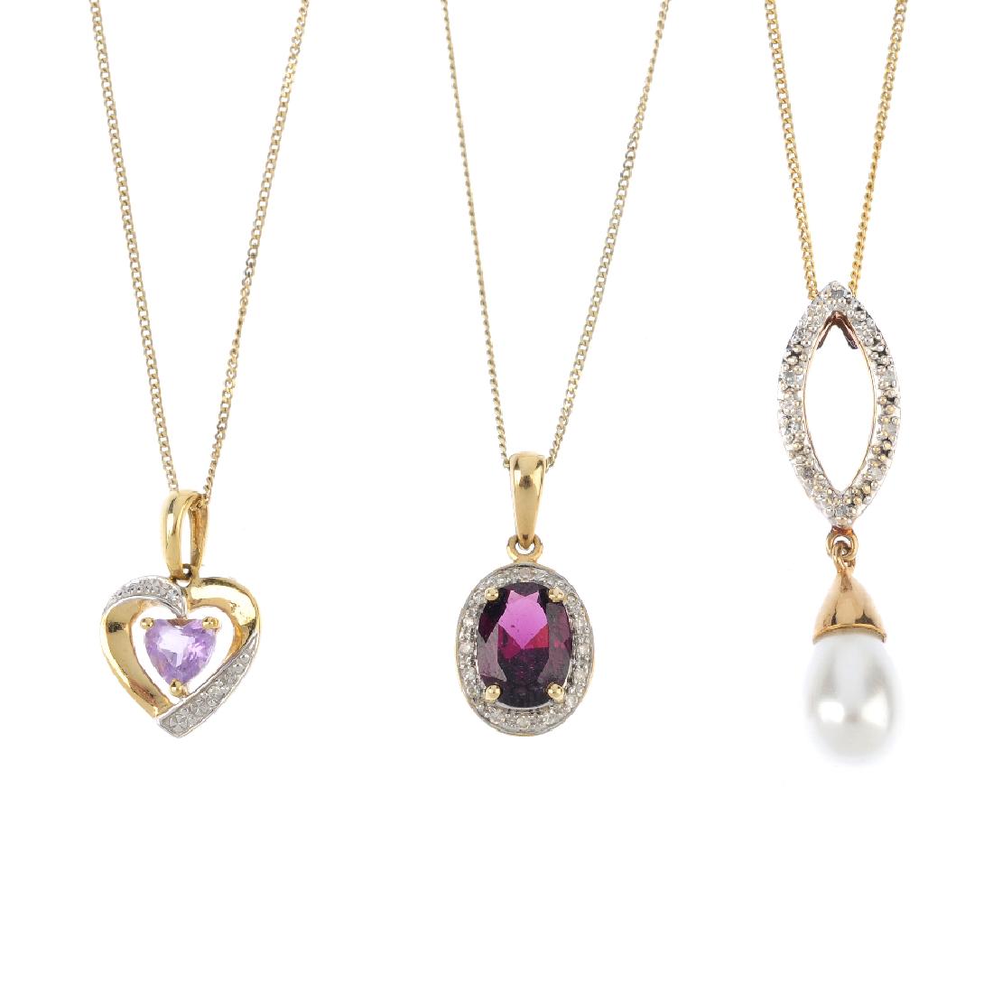 Three diamond and gem-set pendants. To include a 9ct