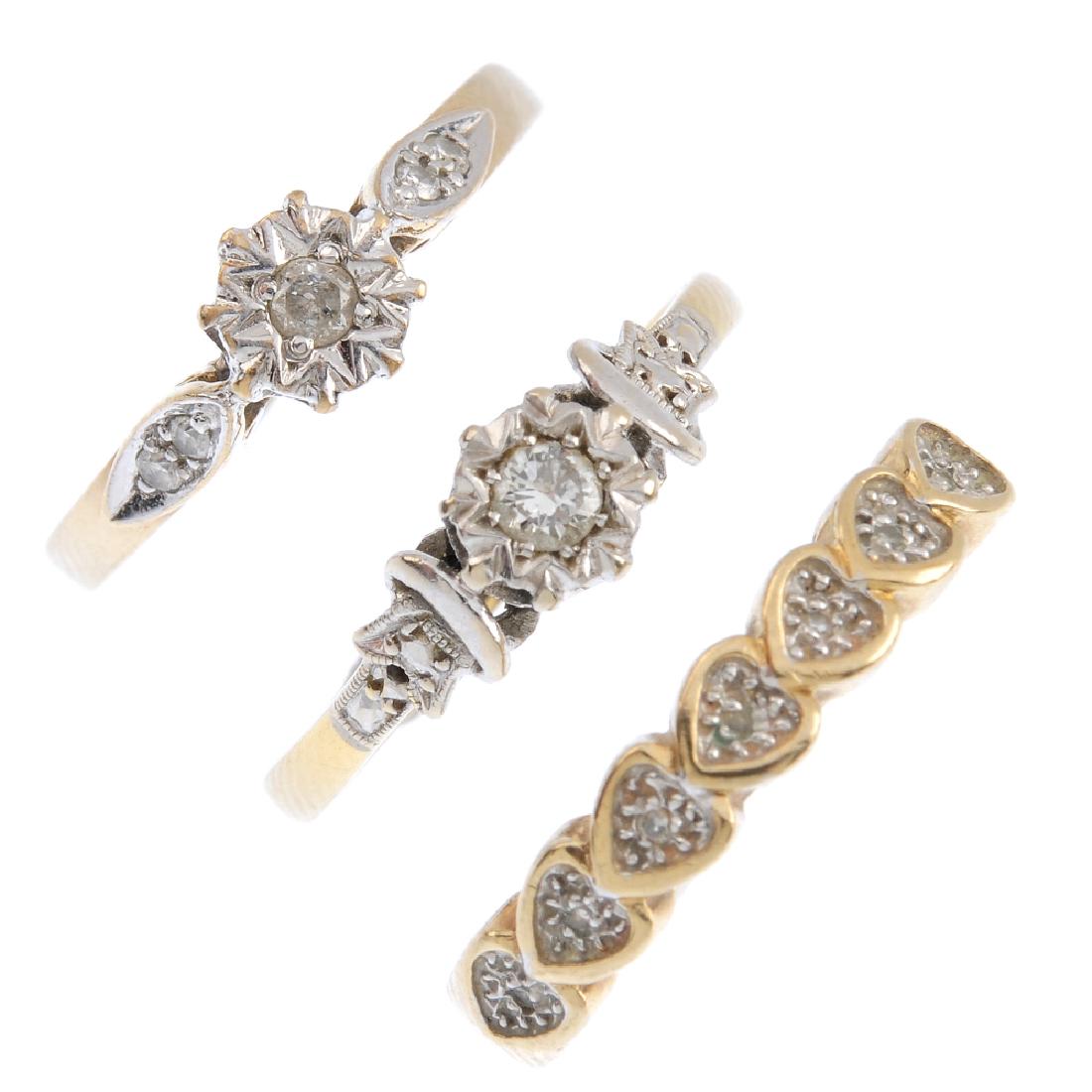 Three diamond rings. To include a 9ct gold illusion-set