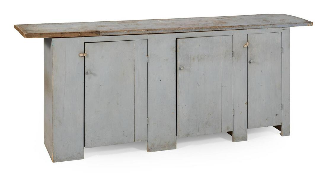 THREE-DOOR CUPBOARD In pine under blue-gray paint.