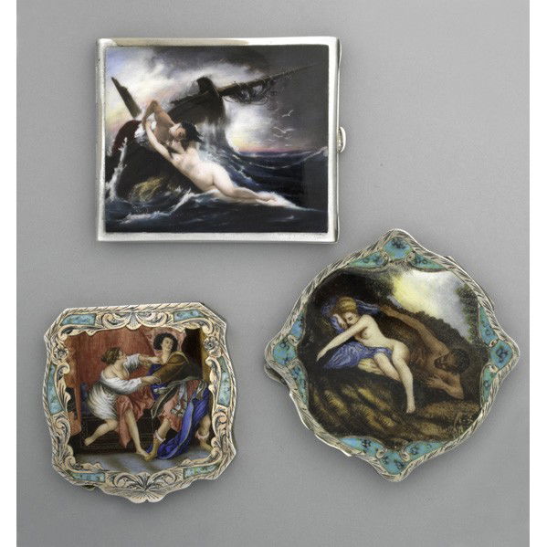 THREE EROTIC CONTINENTAL ENAMELED SILVER COMPACTS