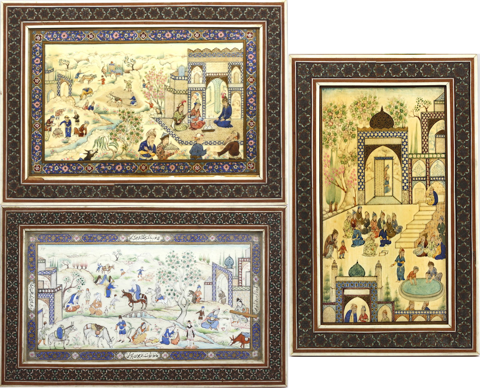 Three Framed Persian Painted Scenic Panels