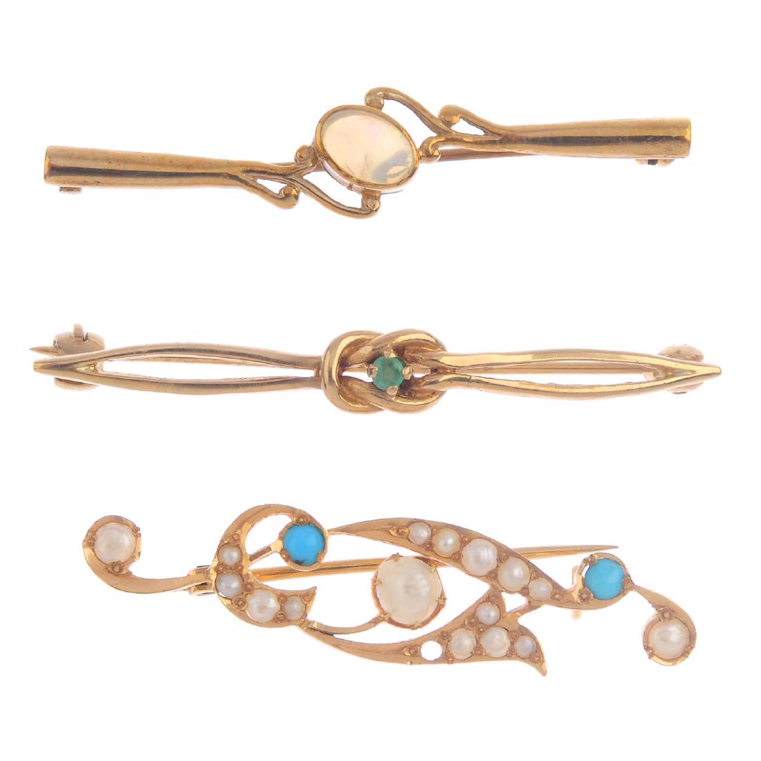 Three gem-set brooches. To include a 9ct gold emerald