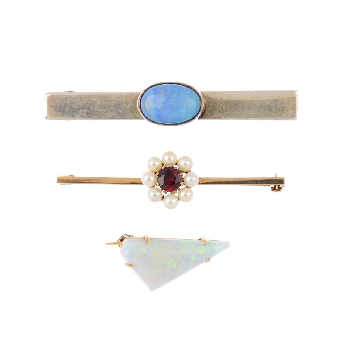 Three gem-set brooches. To include a 9ct gold opal