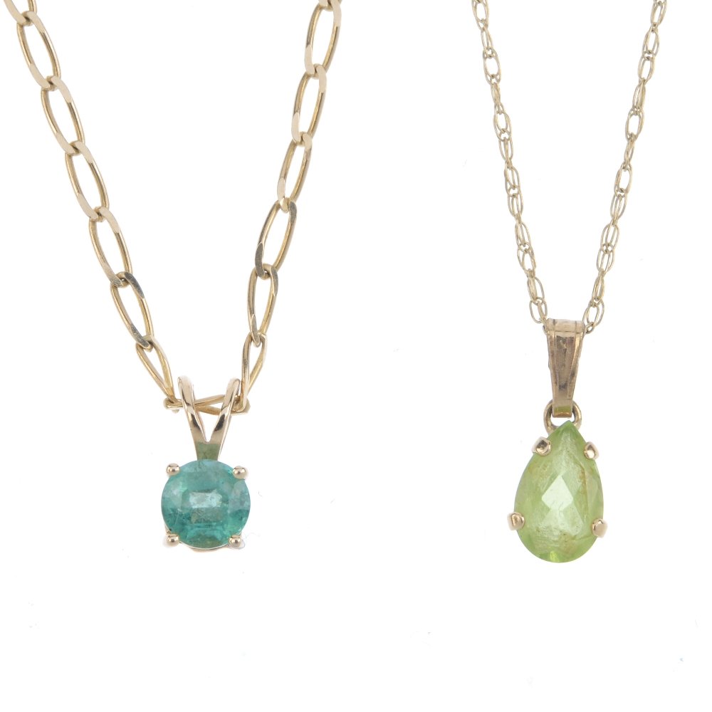 SoldA selection of four gem-set pendants and three chains.A selection of four gem-set pendants and three chains. To include a 9ct gold pear-shape citrine single-stone pendant, a peridot and diamond point pendant, two further pendants and three fine-link chaiSee Sold Price