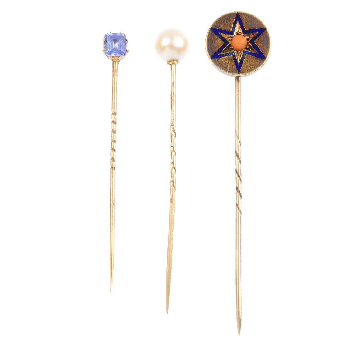 Three gem-set stickpins. To include a sapphire