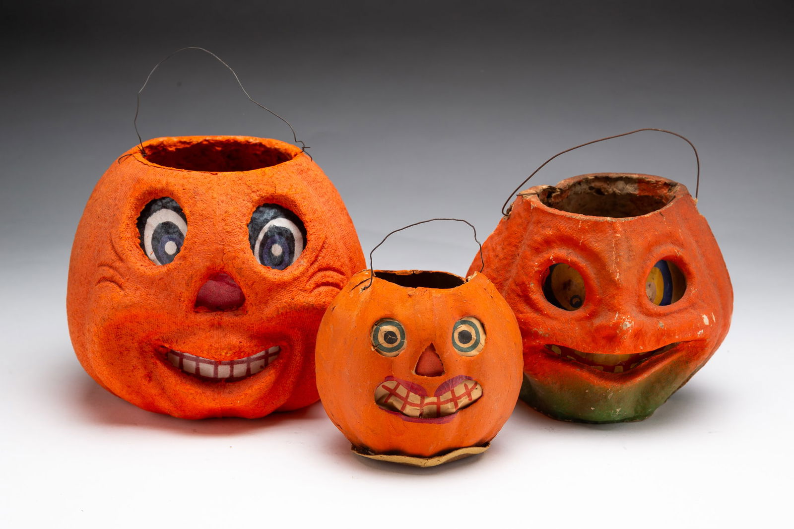 THREE GERMAN PAINTED PAPER PULP HALLOWEEN JACK-O-LANTERNS.