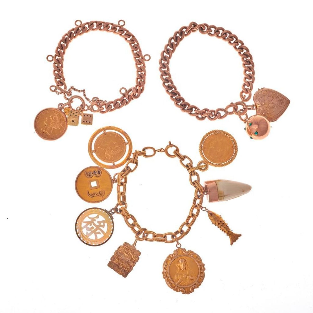 SoldThree 14K Yellow Gold Whimsical Charm BraceletsFirst bracelet with three unmarked charms. 7"l and appx. 9.25 dwt twt. The second bracelet has twenty charms. Including, a 14K bell, 585 (14K) stein, 14K Colorado, 14K plaque, 14K "21", 14K pineapple,See Sold Price