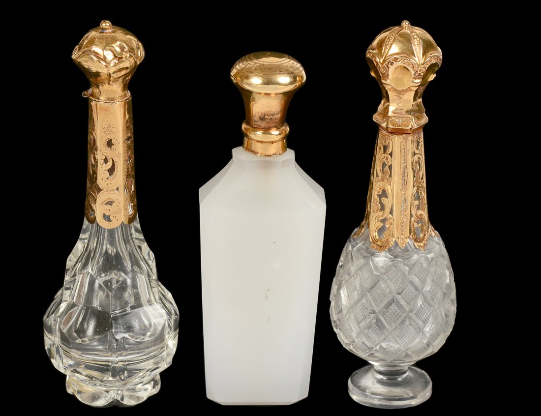 THREE GOLD MOUNTED GLASS PERFUME BOTTLES