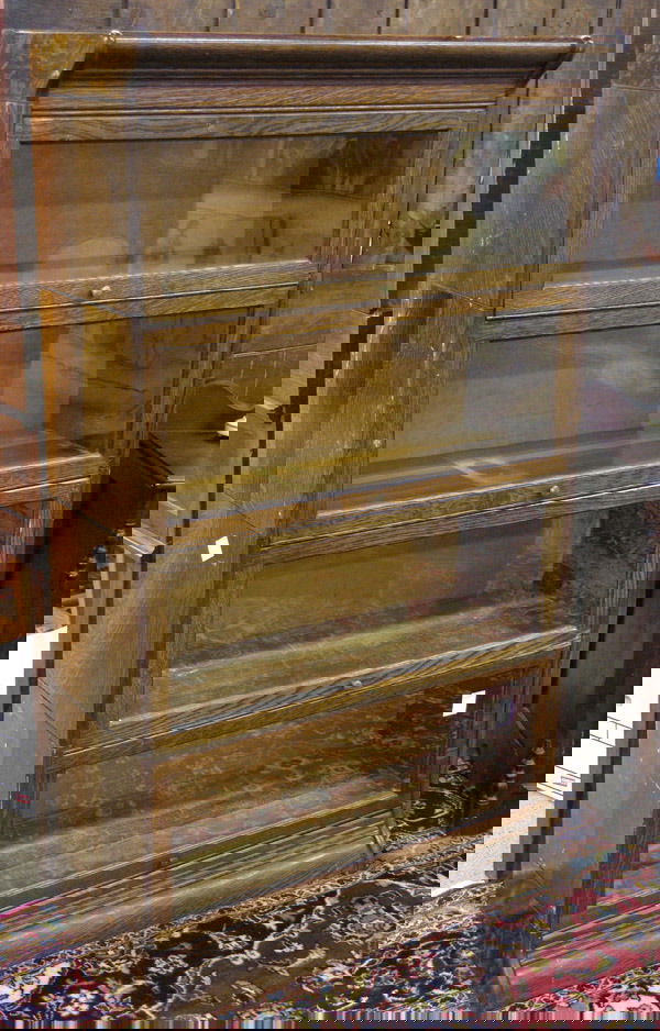 SoldGUNN OAK FOUR-STACK SECTIONAL BARRISTER'S BOOKCASEOak barrister's/ lawyer's bookcase, Gunn Sectional Bookcase, early 20th c., four stacked sections with glazed doors, approx 60"h, 50.5"w, 14.5"d **Note: one of a pairSee Sold Price