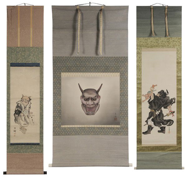 SoldA group of three Japanese hanging scrolls,A group of three Japanese hanging scrolls, A group of three Japanese hanging scrolls, 20th century, of prints on paper, comprising one in the style of Sasaki Senkei (1773-1848), of a shogun seated undSee Sold Price