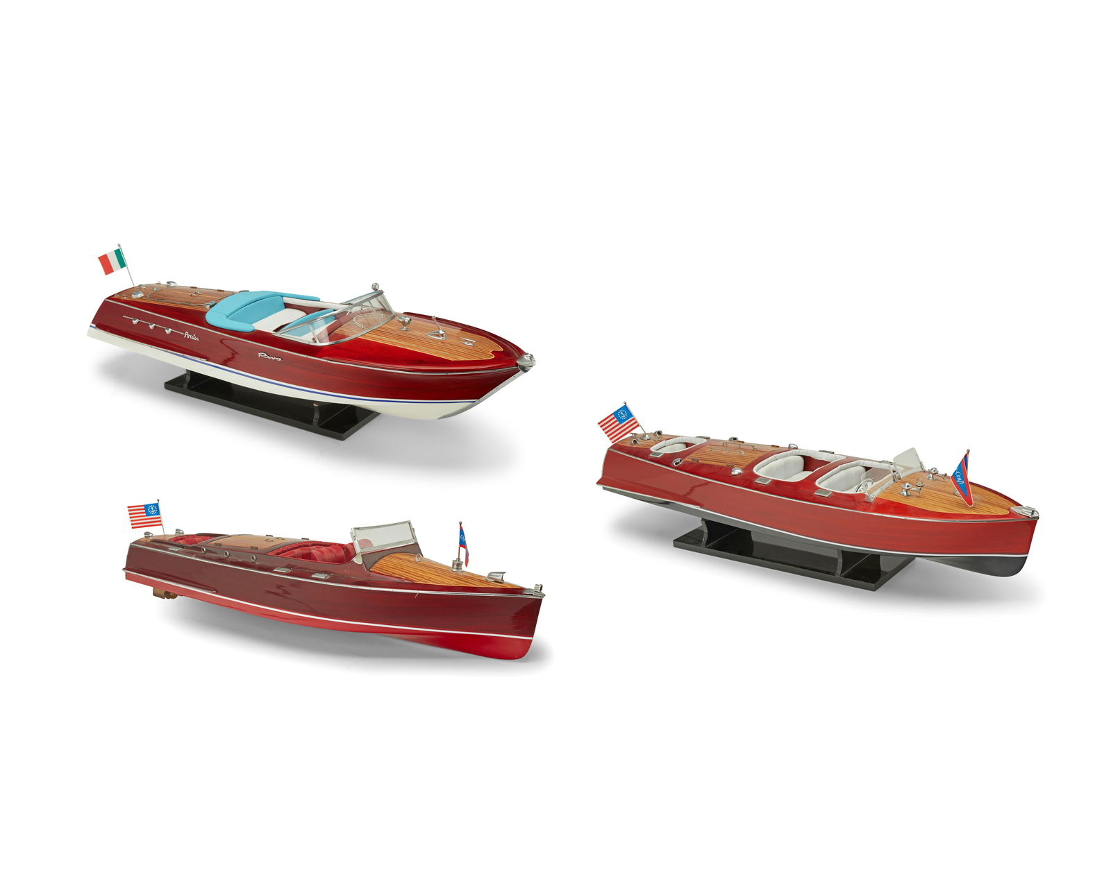 Three lacquered wood model speedboats