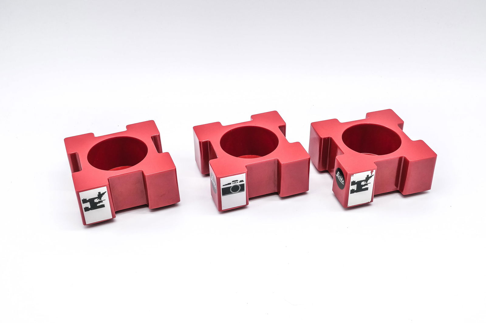 Three Leitz red plastic lens display stands