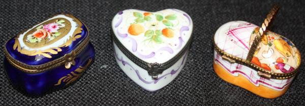 Sold3 Limoges France Painted Porcelain Trinket BoxesThree Limoges France Hand Painted Porcelain Trinket Boxes.Largest measures 1inch x 2.25 inches x 1.5 inches.See Sold Price