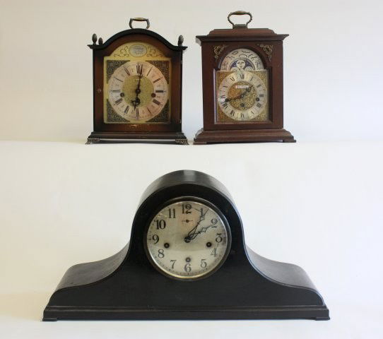 SoldThree wooden mantle clocks together with two smaller clocks 20 x 29 cm (5).Three wooden mantle clocks together with two smaller clocks 20 x 29 cm (5).See Sold Price