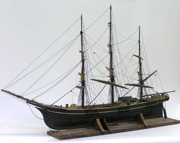 SoldLARGE EARLY THREE-MASTED SAILING SHIP MODELFully detailed unidentified US Sailing Ship, a freighter, with planked hull, proper framing, deck details, cloth sails and string rigging, green and black hull, mounted on a molded mahogany base, 69"See Sold Price