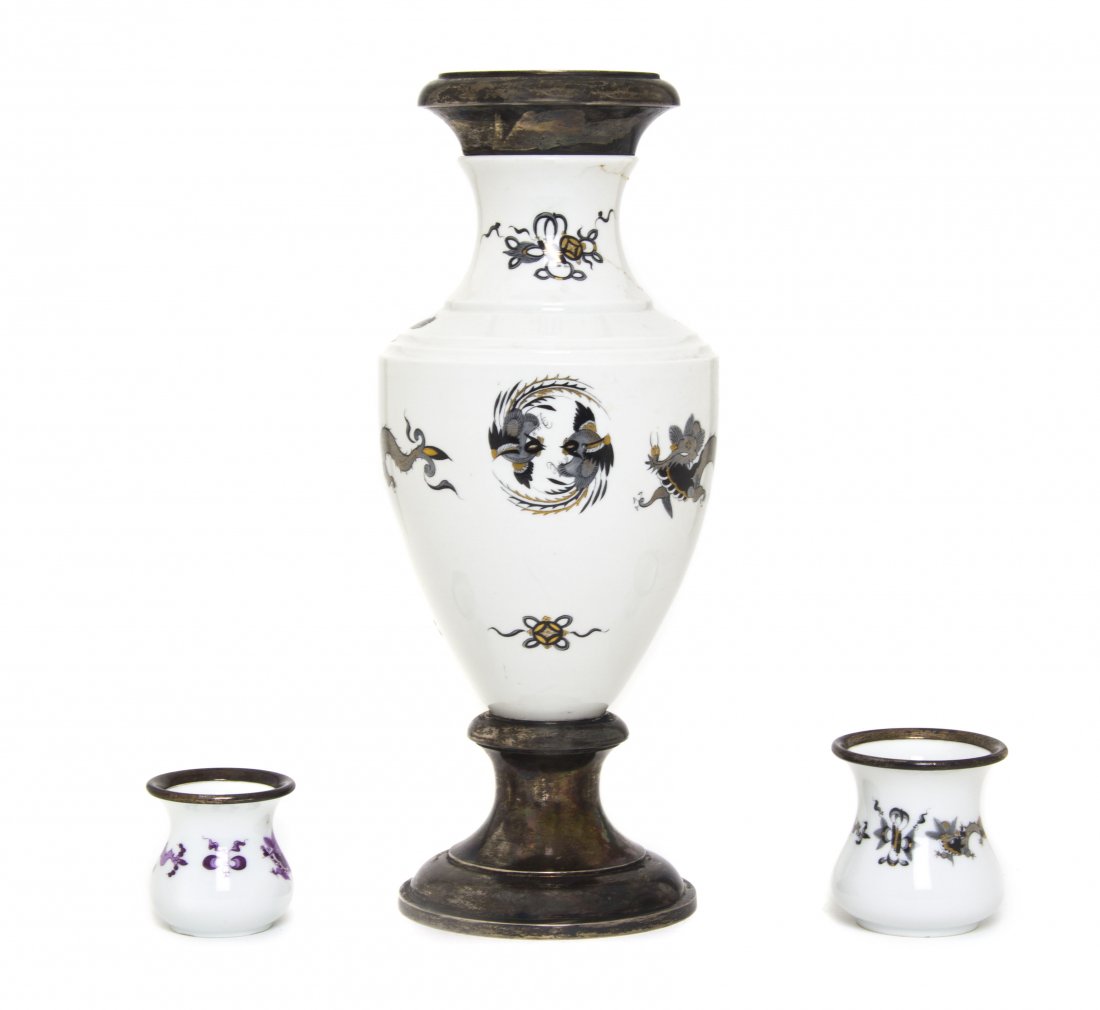 Three Meissen Porcelain Silver Mounted Articles, H