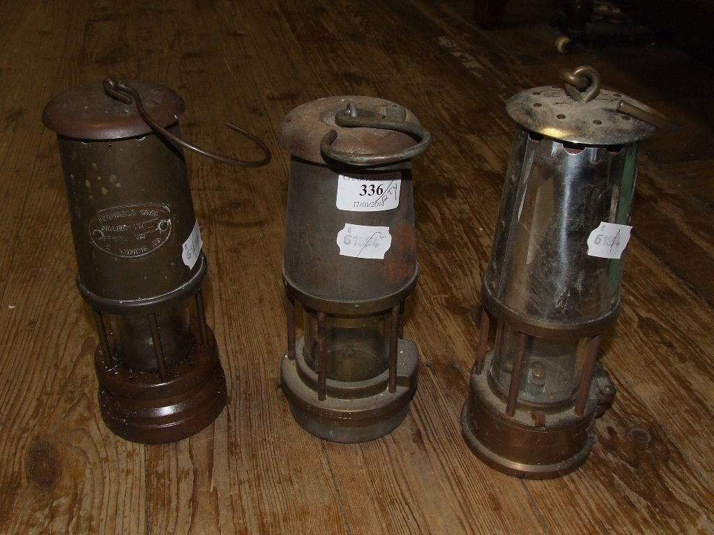 Three miners' lamps, assorted binoculars, various