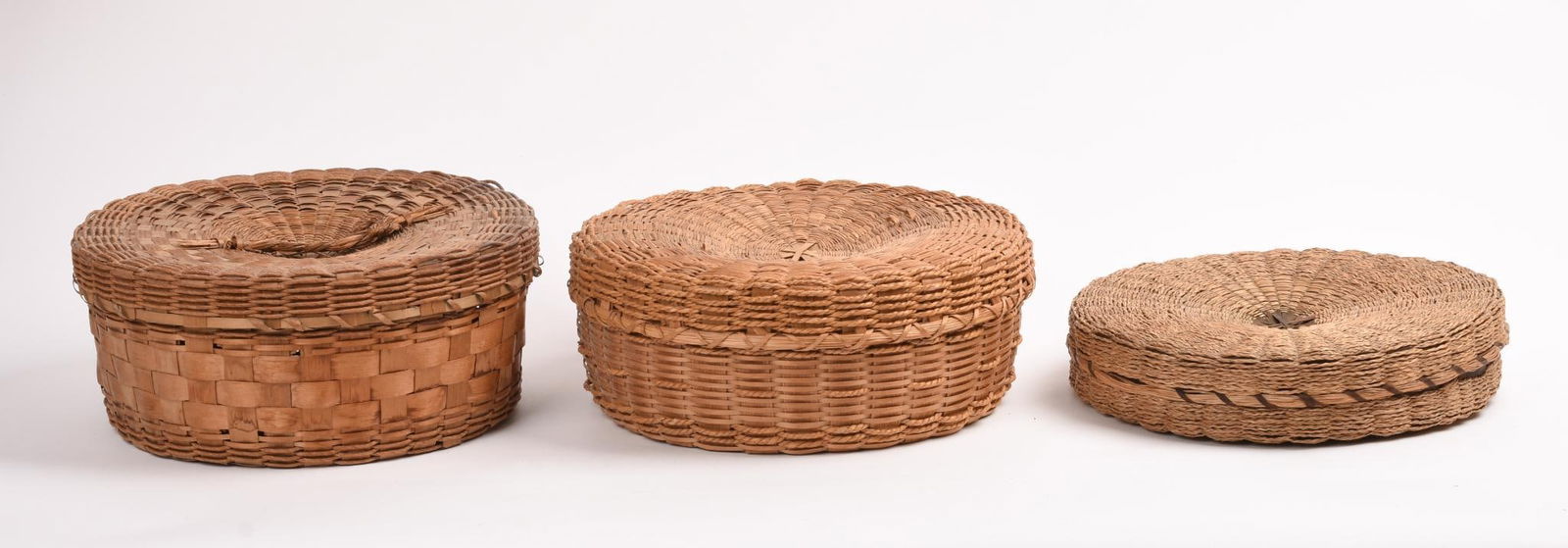 Three Native American Sweetgrass and Ash Lidded Baskets.