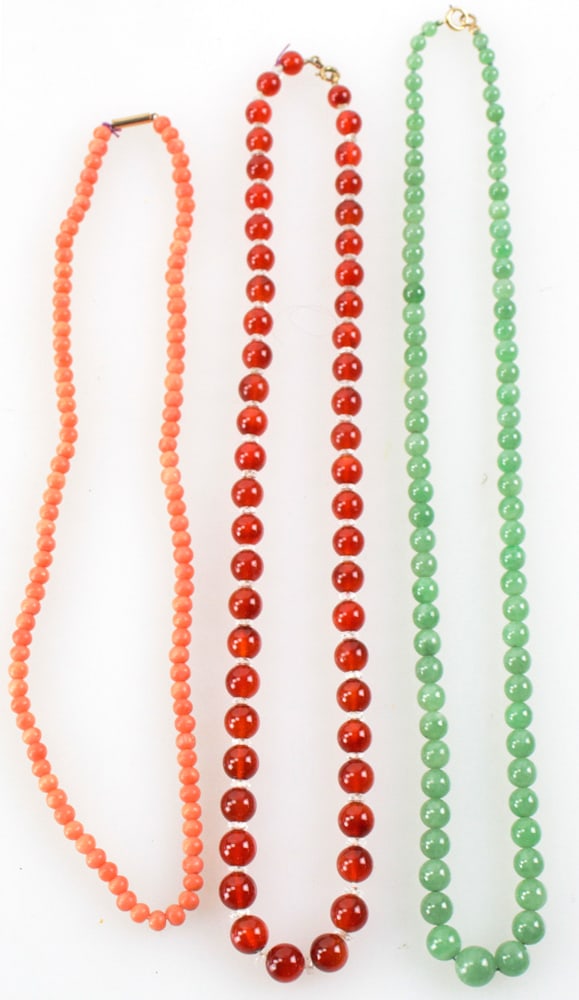 Three Necklaces, Carnelian, Coral, Jade