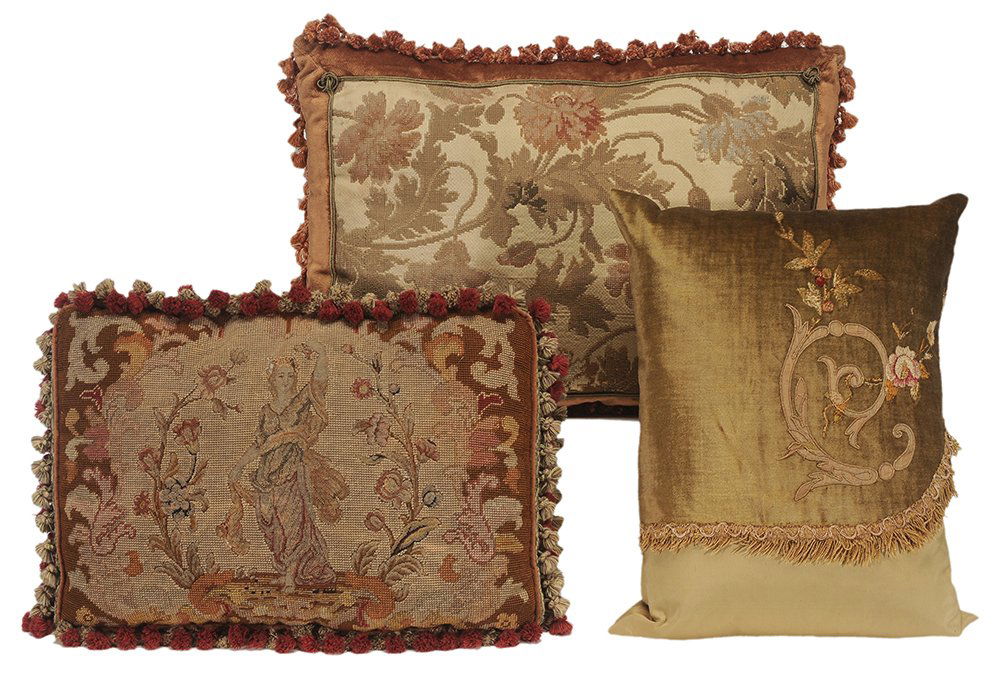 SoldThree Pillows Fashioned from Antique TextilesThree Pillows Fashioned from Antique Textiles, comprising an Aubusson tapestry with velvet backing, an antique silk gold damask with gimp and an antique needlework panel on a new silk ground with silkSee Sold Price