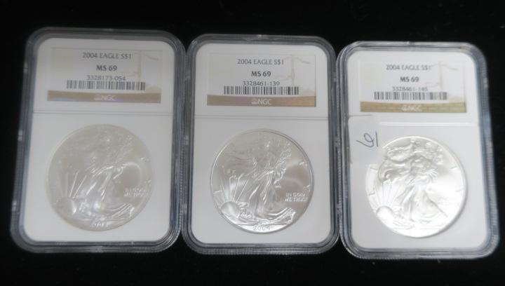 Three NGC Graded 2004 $1 SILVER EAGLES MS 69: