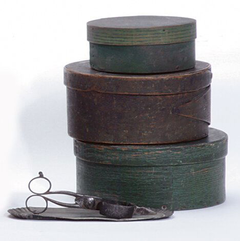 THREE PAINTED PANTRY BOXES AND A TINWARE CANDLE S
