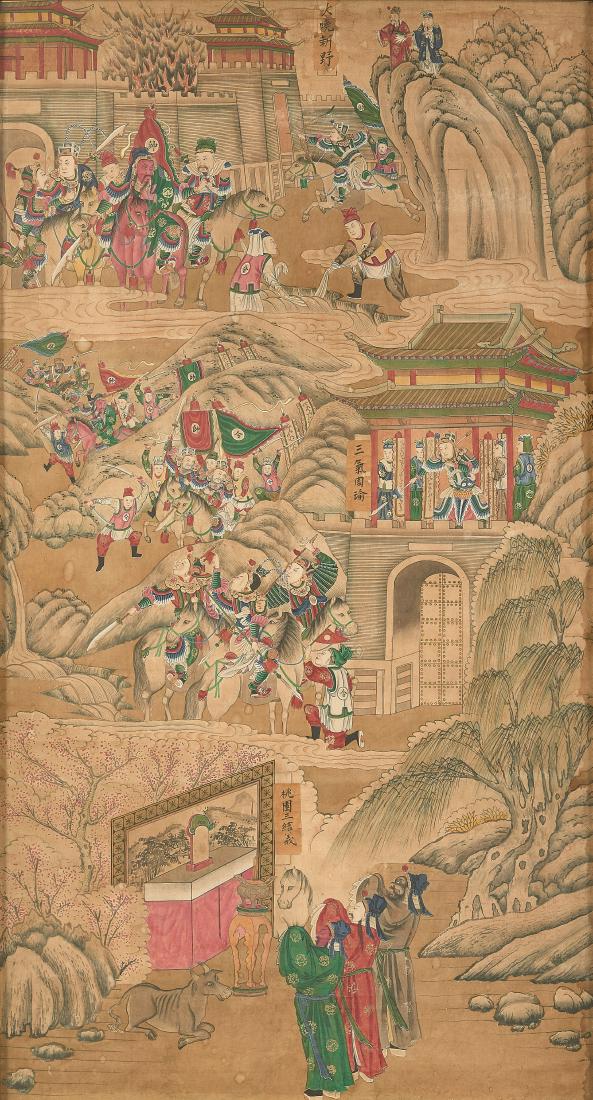 Three panels depicting battles and classical stories