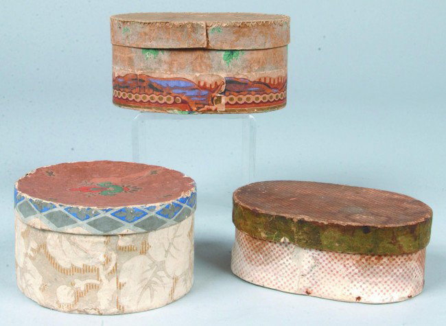 Three Pasteboard Wallpaper Covered Boxes, 5"dia.,