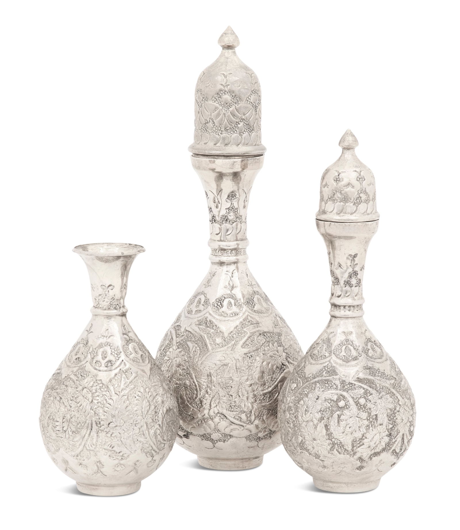Three Persian Hammered Silverplate Copper Bottles