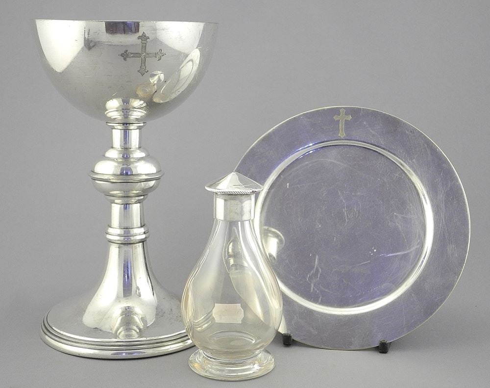 Three Piece Silver Plated Ecclesiastical Chalice/Paten/Cruet, 7"h.