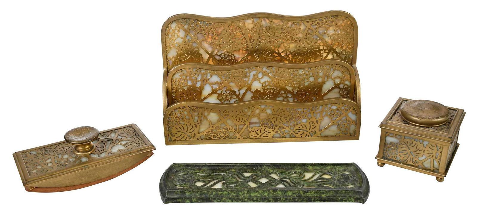 Tiffany Studios New York Pine Needle Bronze Doré and Favrile Slag Glass Five-Piece Desk SetLiberty & 33rd Furniture Co.4.4(18)$1,0005 days Left