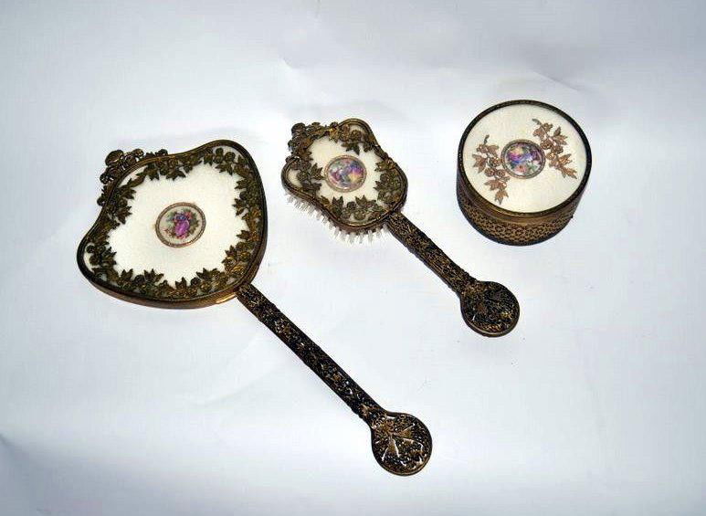 SoldThree Piece Vanity Set And Enamel Mirror With Bird MotifThree piece vanity set and enamel mirror with bird motif.See Sold Price