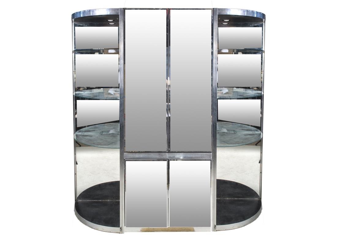 SoldModern Chrome Milo Baughman Style Shelf Wall UnitThree piece Etagere display shelf units. Cubist stacked mid century modern form. Chrome frames with glass shelves. Two tallest measure 72 1/2". Smallest measures 67 1/2". Being sold in the style of MiSee Sold Price