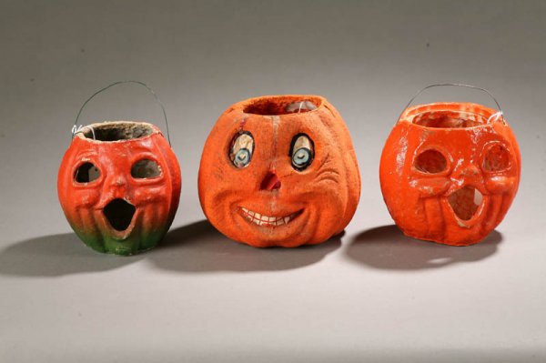 THREE PUMPKIN LANTERNS. All paper mache with ora