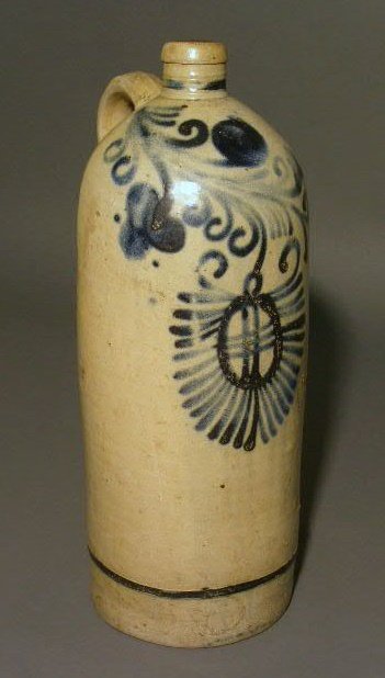 Three-quart stoneware jug, 19th c., with blue deco