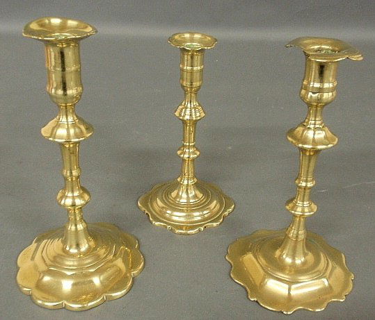 Three Queen Anne brass petal base candlesticks, 18th c.