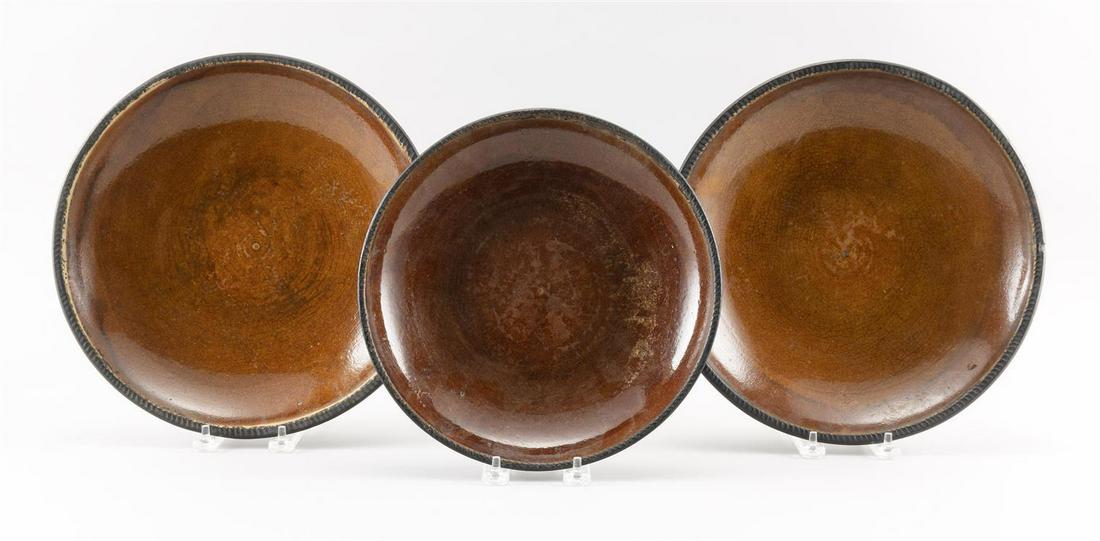 THREE REDWARE DISHES Circular, with shallow sides and