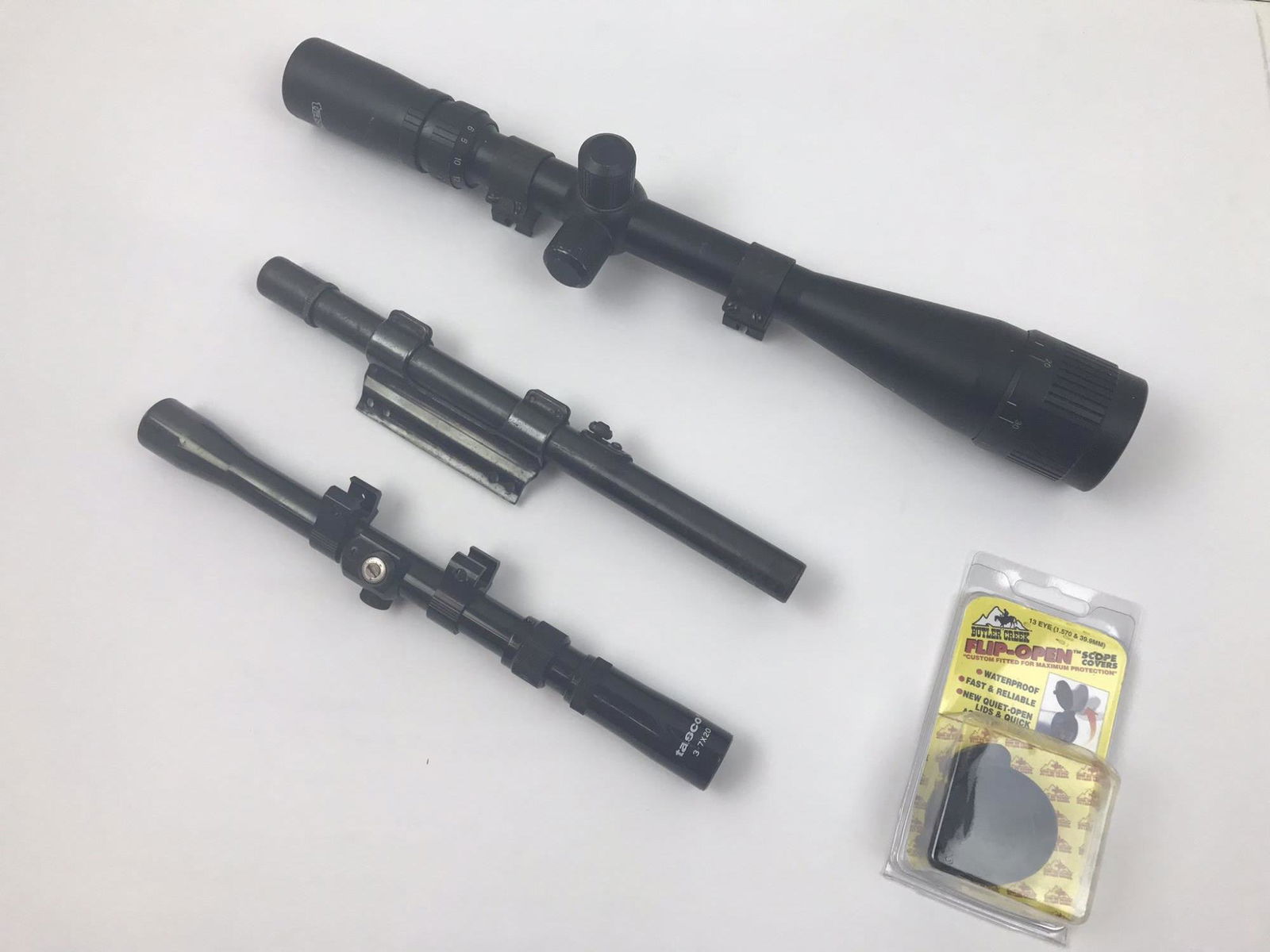 THREE RIFLE SCOPES AND SCOPE COVER