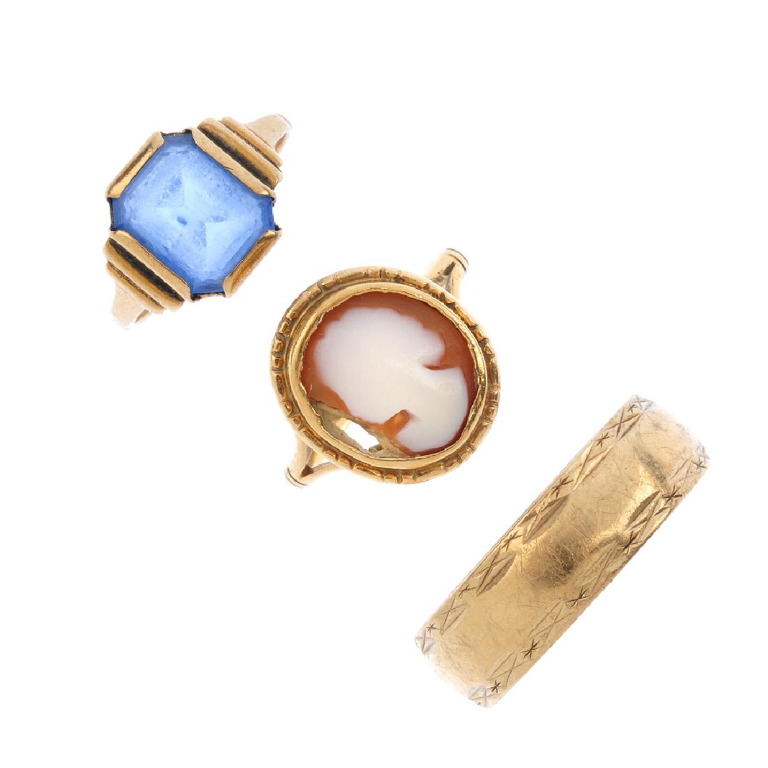 Three rings. To include a 9ct gold band ring, a