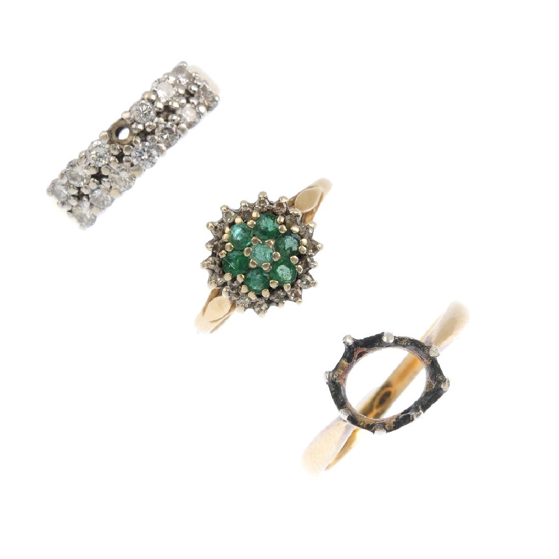 Three rings. To include a 9ct gold emerald and diamond