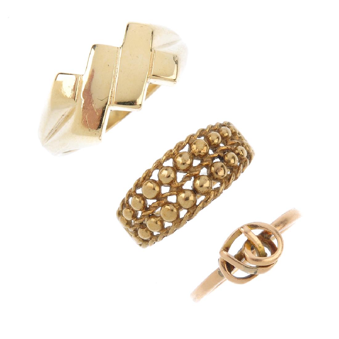 Three rings. To include a 9ct gold ring with beads and